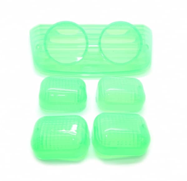 Komplet sæt med 4 blinklysglas og 1 baglygteglas i grøn. Leveres uden pærer.