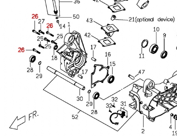 Original bolt, der bruges når motorsiderne skal samles. Der skal bruges 3 stk. af denne bolt – det er nr. 26 på billedet.