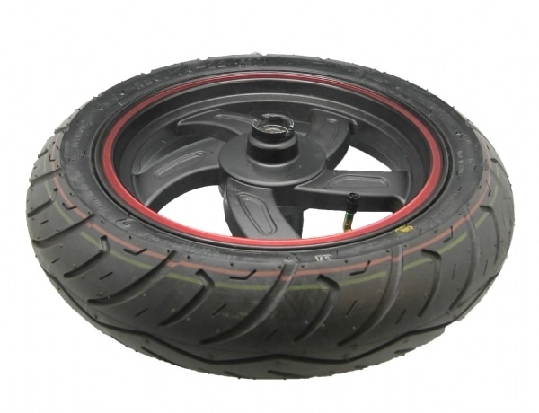 Komplet forhjul med dæk – fælgen er sort med en rød dekal rundt i kanten.