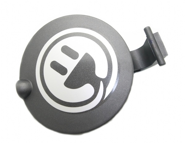Mat grå klap med dekal over ladestikket til E-Force kabinescooter.