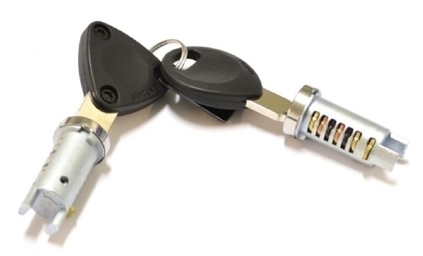 Låsesæt med 2 låsecylindre samt 2 nøgler.