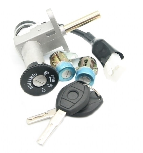 Komplet låsesæt med tændingslås og to låsecylindre til dørene. Leveres med to nøgler.
