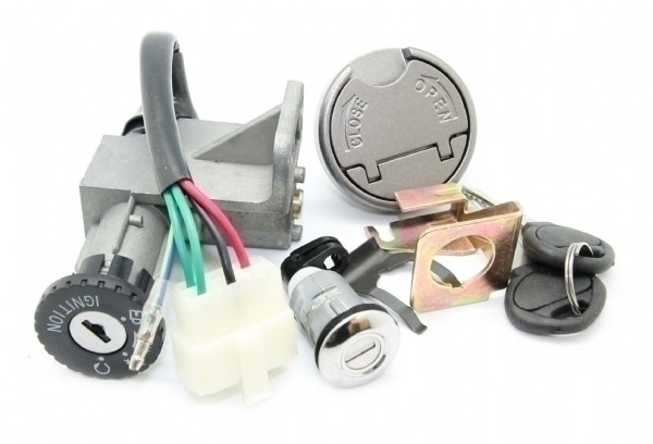 Komplet låsesæt med tændingslås, lås til sædet og benzindæksel.