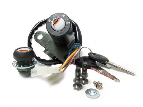 Komplet og originalt låsesæt, der passer på de nye modeller af Derbi Senda og Gilera RCR/SMT.