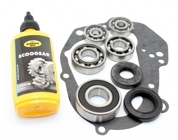 Renovationskittet indeholder lejer til bagaksel, motorblok, koblingsaksel og transmissionsaksel samt pakdåse til koblings og baghjulsakslen, pakning og en ny tube gearolie.