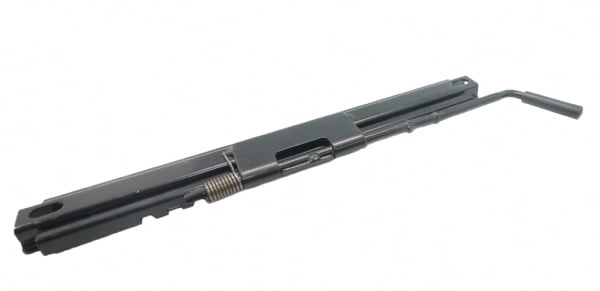 Sædeskinne til venstre side med håndtag til regulering af sædet.