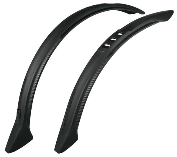 Skærmsæt i sort plast til cykler med 20″-hjul. Leveres uden stivere.