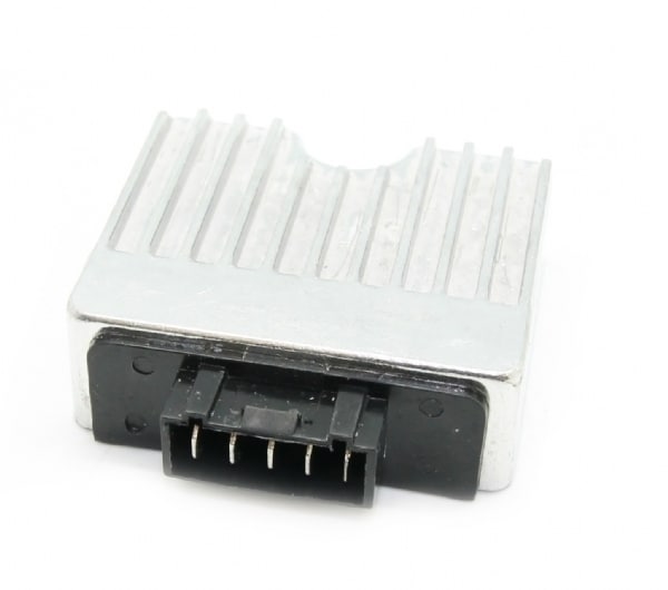 Spændingsregulator til Suzuki Katana. Stikket er fladt og har 5 fladeben op højkant.