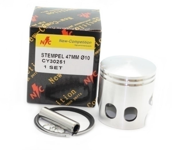 Komplet stempel med låse- og stempelringe samt Ø10 krydspind. Stemplet kan bruges til støbejerns cylinderkit i 47,0mm, der skal have et stempel med 2 stempelringe!