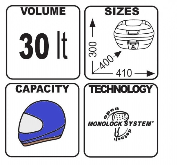 Bestseller topboks fra GIVI! Topboksen har medfølgende universal topplade og kan blive monteret direkte på de fleste scooterbagagebære. Boksen kan rumme 1 hjelm og må maksimalt lastes med 3 kg. Til boksen kan tilkøbes farvede låg og ryglæn. Mål (HxBxD): 300x410x400 mm