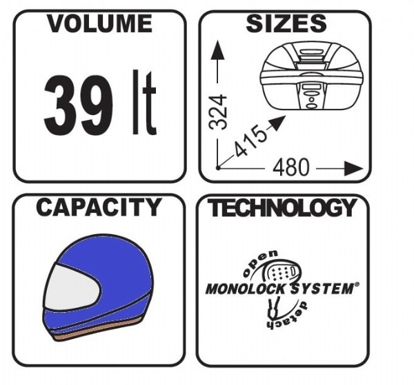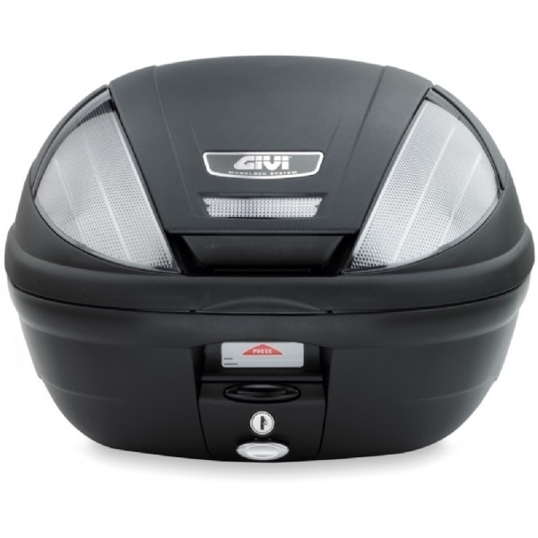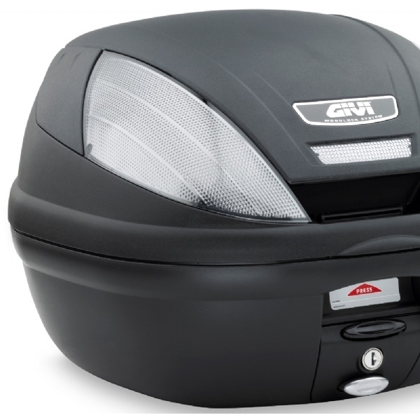 Kompakt scooter topboks fra GIVI. Topboksen har medfølgende universal topplade og kan blive monteret direkte på de fleste scooterbagagebære. Boksen kan rumme 1 hjelm samt handsker og regntøj og må maksimalt lastes med 3 kg. Til boksen kan tilkøbes farvede låg, indertaske, stoplys og ryglæn. Mål (HxBxD): 324x480x415 mm