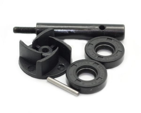 Komplet sæt til renovering af vandpumpe, der indeholder 2 pakdåser, aksel, stift og skovlhjul.