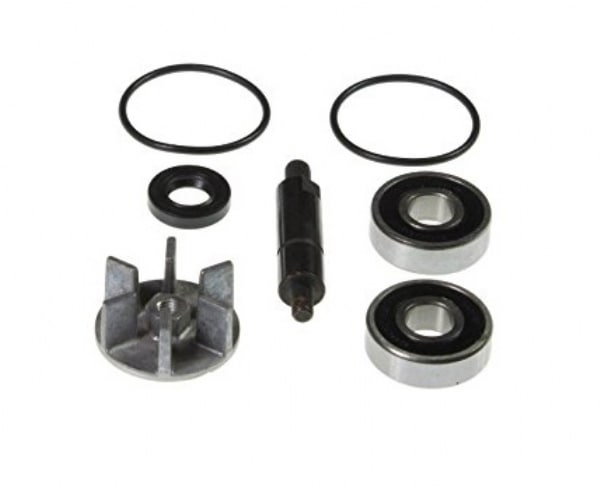 Rep.-kit til vandpumpen på Derbi scootere, der indeholder pakdåser, lejer, pakninger samt vandpumpeaksel og hjul.